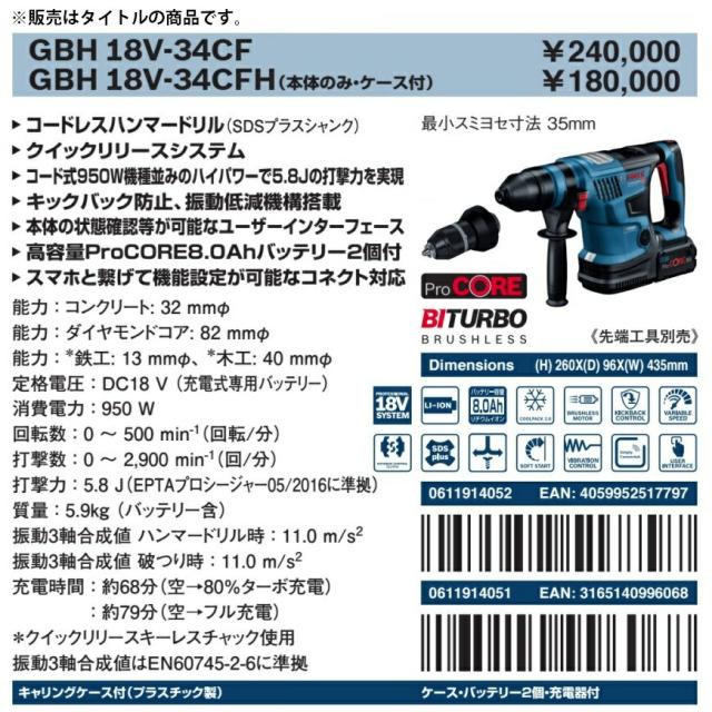 (ボッシュ) コードレスハンマードリル BITURBO+SDS plus GBH18V-34CF バッテリx2個+充電器+ケース付 コードレスSDSプラスハンマードリル 18V対応 BOSCH