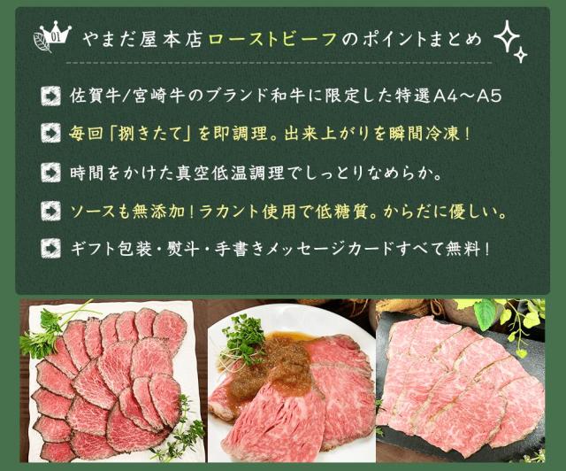 やまだ屋本店で取り扱っている黒毛和牛(宮崎牛・佐賀牛・鹿児島黒牛のA5〜A4ランク)で作った【特選和牛ローストビーフ(ランプ)】です。