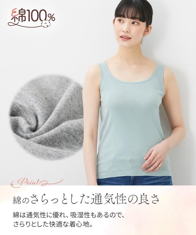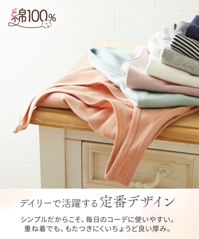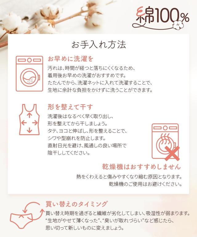 素肌に直接触れるインナーだからこそ、通気性良く肌ざわりのやさしい綿100%をおすすめします。