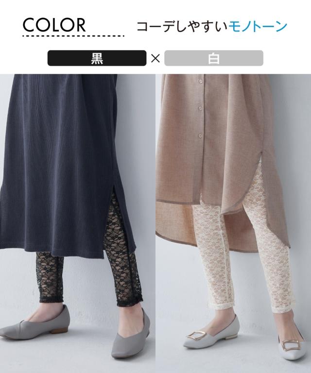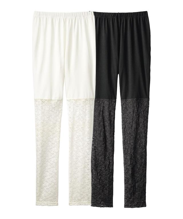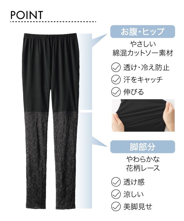 [keyword] レディース ファッション 女性 下着 ランジェリー インナー 大きいサイズ ぽっちゃり ふくよか プラスサイズ ラージ 標準サイズ 普通サイズ ゆったりサイズ 綿混 コットン混 綿素材 綿 コットン お買い得セット まとめ買い セット お得 ルームウェア 春 [comment] レースの透け感で涼しく美脚見せ2枚組綿混レース切替レギンス 〜DESIGN〜 レースの透け感足元華やかに 美脚見せが叶う コーデに差がつく優秀レギンス 〜MATERIAL〜 透け感が美しい繊細なレース 〜POINT〜 【お腹・ヒップ】 やさしい綿混カットソー素材 〇透け・冷え防止 〇汗をキャッチ 〇伸びる 【脚部分】 やわらかな花柄レース 〇透け感 〇涼しい 〇美脚見せ 〜COLOR〜 コーデしやすいモノトーン 〜SIZE〜 きっと見つかる自分サイズ どんな体型の方にもご満足いただけるようサイズを多数揃えました! 10Lサイズまで!豊富な7サイズ展開
