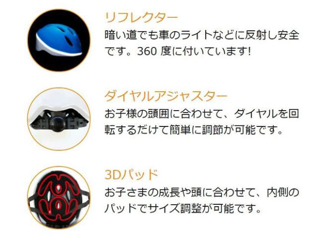 360 度!リフレクターが付いているので、暗い道でも車のライトなどに反射し安全です。ダイヤルアジャスターの採用により、お子様の頭囲に合わせて簡単にサイズ調節が可能です。あごひもにバックルを採用することにより、ワンタッチで簡単に着脱が可能です。更に、3Dパッドの採用により、お子様の成長や頭に合わせてヘルメット内側のサイズ調節が出来ます。