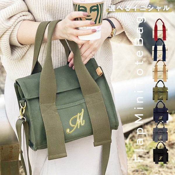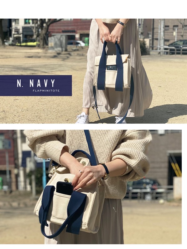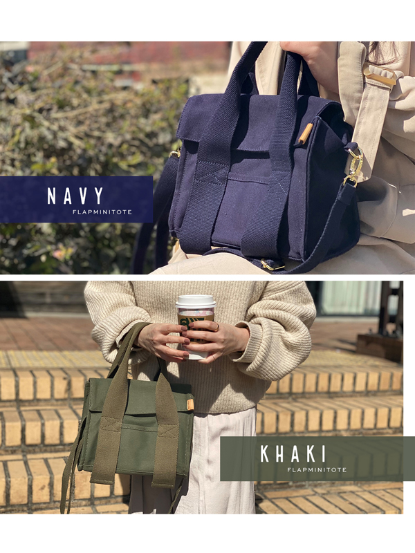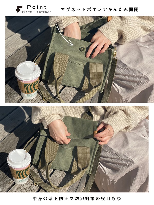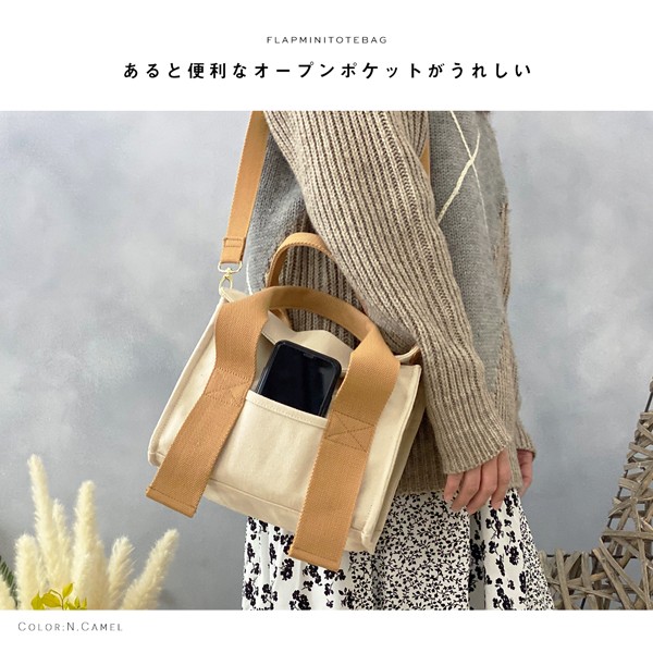 中身をカバーするフラップミニトートバッグ。