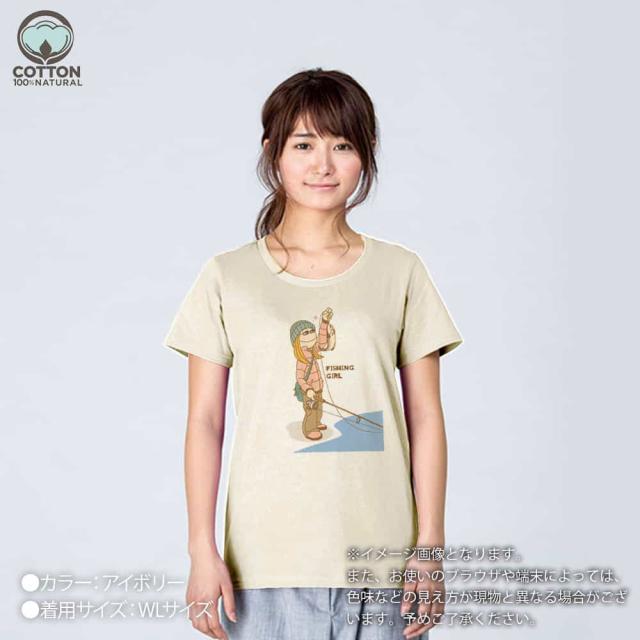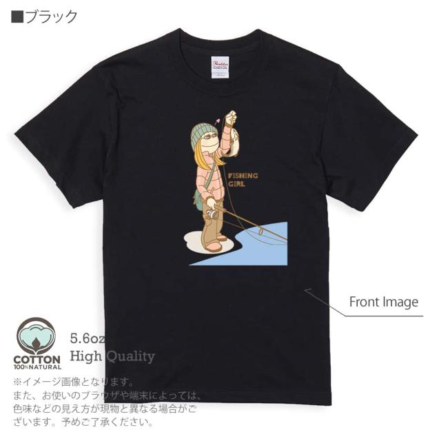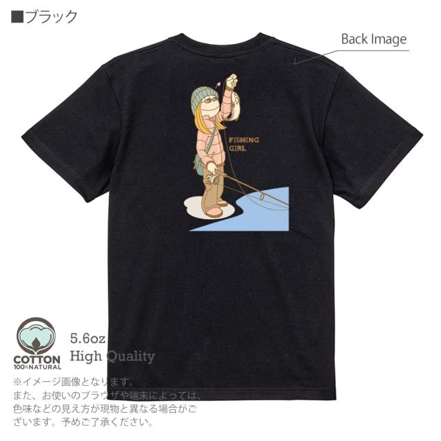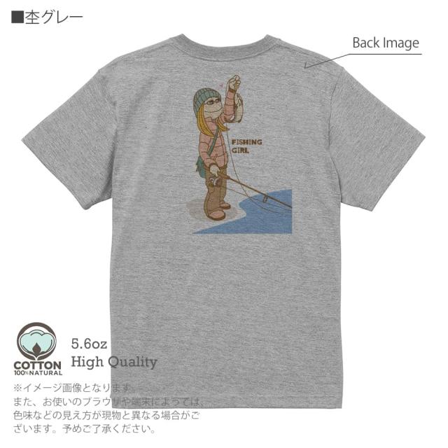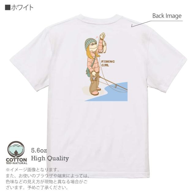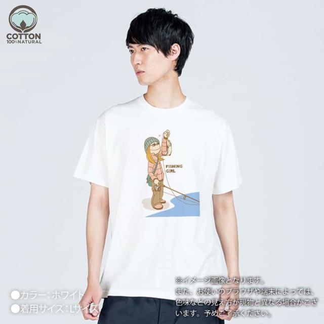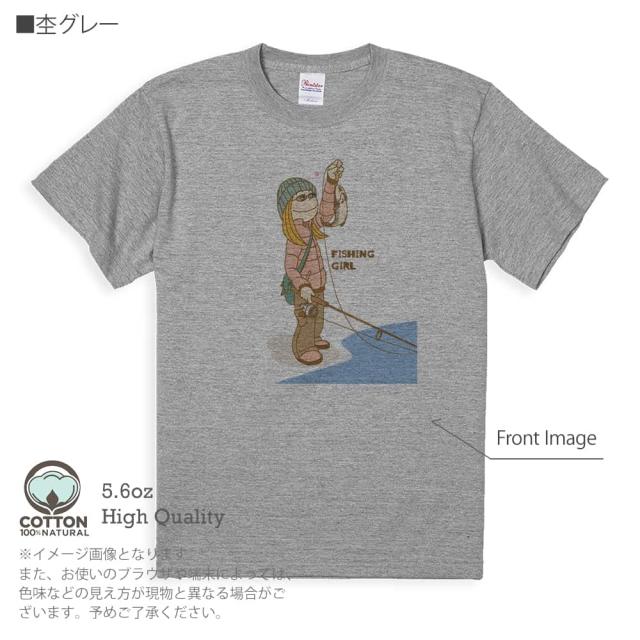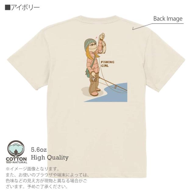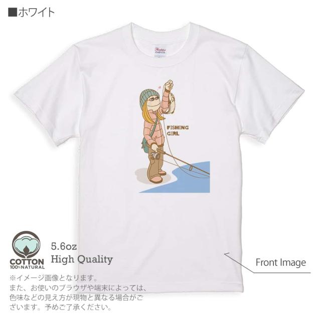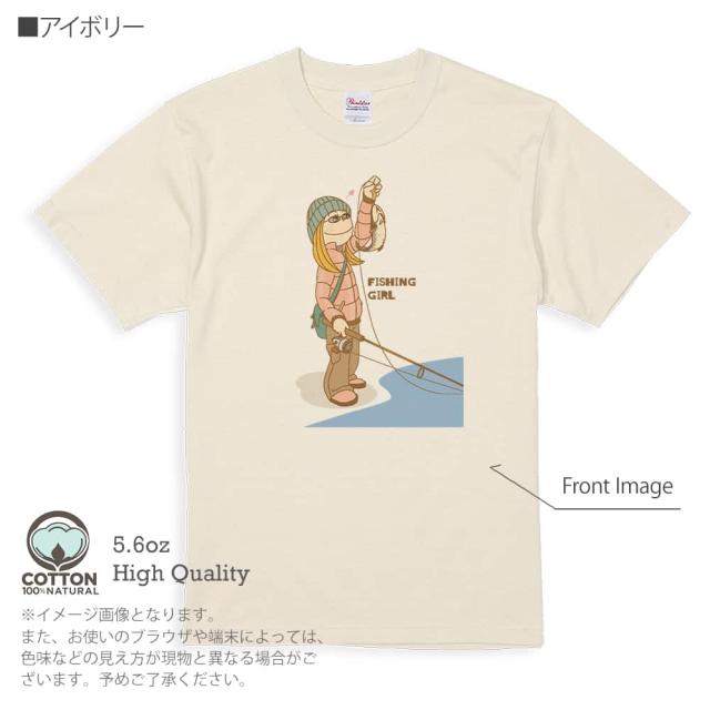 釣り Tシャツ 半袖 釣りガール イラスト 5.6oz (オンス) 綿100% メンズ レディース 洗濯 大きいサイズ ホワイト ブラック グレー アイボリー 白 黒 灰色 肌色 春 夏 秋 冬 オシャレ 釣り 魚 ルアー