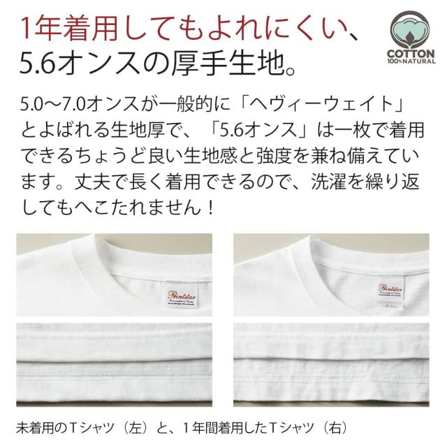 | Tシャツのメーカー | Printstar(プリントスター)…累計1.5億枚以上販売されているキングオブTシャツ。洗濯してもヨレがすくなく、タフなTシャツです。 |