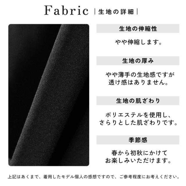ポリエステルとレーヨンを使用し、落ち感のある生地に仕上げました。見た目には艶があり、きれいめな印象を実現。ポリウレタンを含むので、伸縮性もあります。
