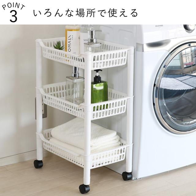 ポリプロピレン製なので、ランドリーなどの水回りでも安心してお使いいただけます。タオルを置いたりシャンプーや洗剤などのボトルを収納してもOK。コンパクトなのでちょっとしたスペースに置くことができます。