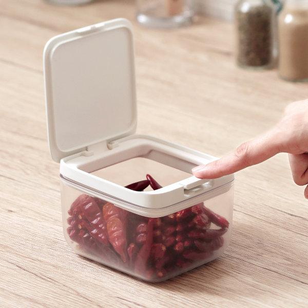 パッキン付きで、湿気を防いでいつでも開封したての美味しさを保ってくれます。また、ワンタッチオープンだから、開け閉めしやすくフタの置き場に困りません。調理中など片手がふさがっていてもラクに開閉できます。