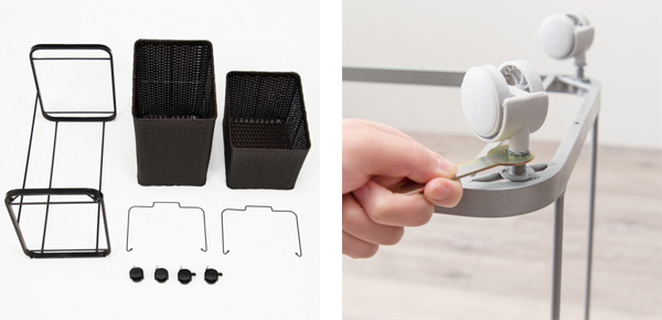 付属のスパナでキャスターを取り付けるだけで簡単に完成します。女性1人でも簡単に組立が可能です。