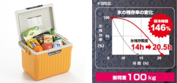 高性能断熱材を使用し、高い保冷効果を持つクーラーボックスです。発泡断熱材の厚みを約2倍、発泡倍率を30倍に性能を上げたことで、大幅に保冷時間のスペックが強化されました。食材や飲み物を美味しい温度で保ってくれるので、レジャー先でも大活躍間違いなしです。