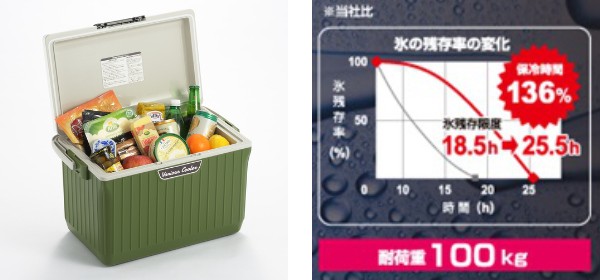 高性能断熱材を使用し、高い保冷効果を持つクーラーボックスです。発泡断熱材の厚みを約2倍、発泡倍率を30倍に性能を上げたことで、大幅に保冷時間のスペックが強化されました。食材や飲み物を美味しい温度で保ってくれるので、レジャー先でも大活躍間違いなしです。