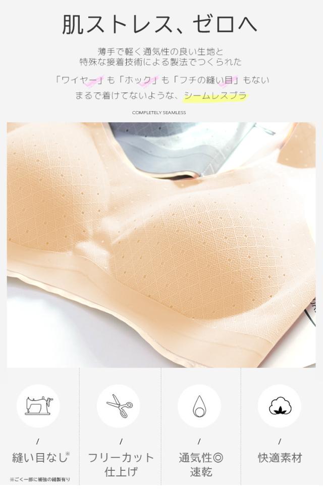 「ワイヤー」も「ホック」も「フチの縫い目」もないまるで着けてないような、シームレスブラ。