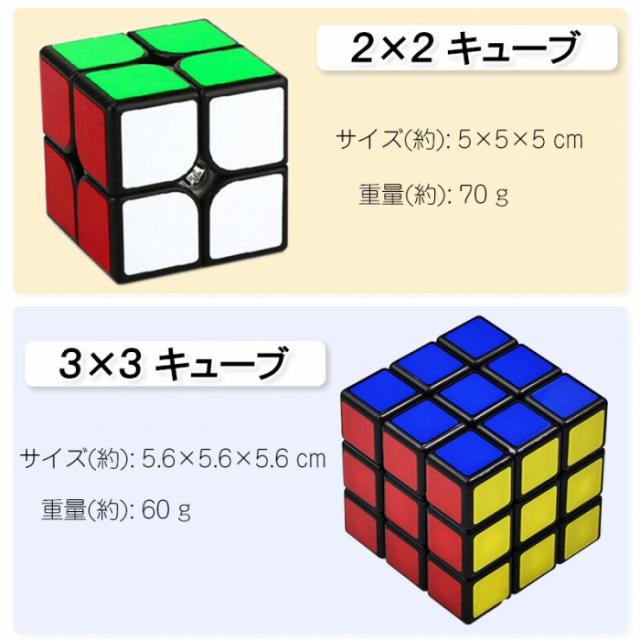 | 主な仕様 | ●商品内容 : キューブ2種類セット (2×2 キューブ 1個 & 3×3 キューブ 1個) ●2×2 キューブ仕様 ・サイズ : 約 5.0 × 5.0 × 5.0 センチ ・重量 : 約 70 グラム ●3×3 キューブ仕様 ・サイズ : 約 5.6 × 5.6 × 5.6 センチ ・重量 : 約 60 グラム |