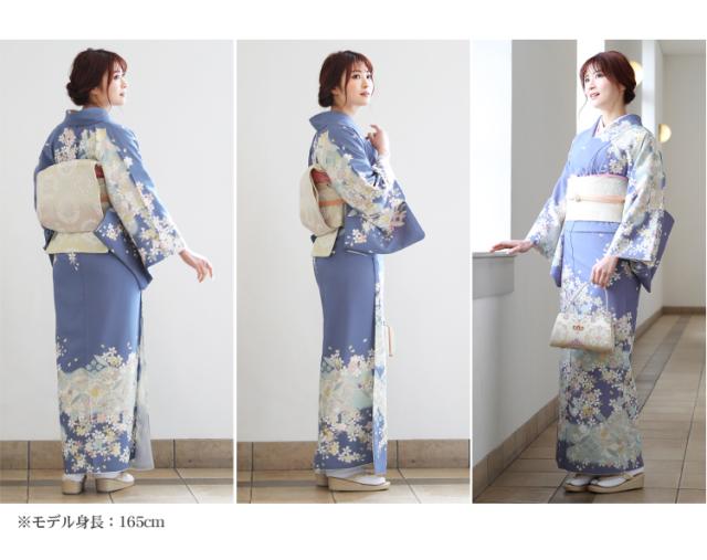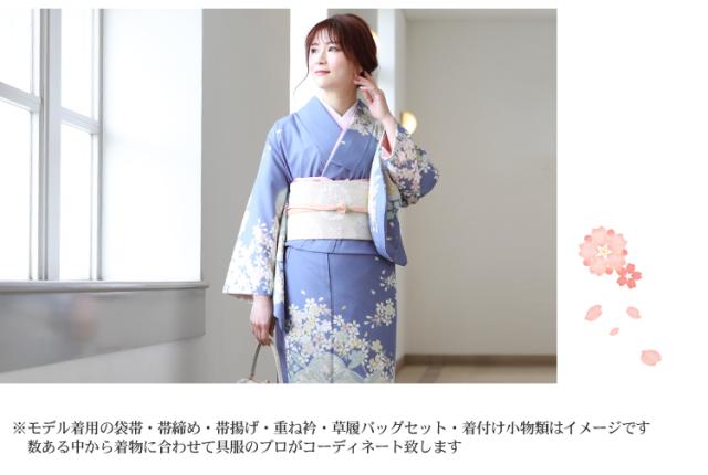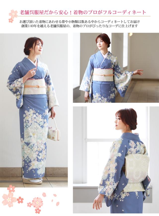 | ※モデル着用の袋帯・帯締め・帯揚げ・草履バッグ・小物類の色、デザインはイメージです。 数ある中から呉服のプロがコーディネートしてお届け致します。 | |||