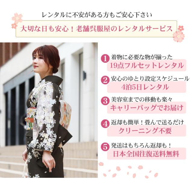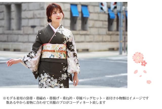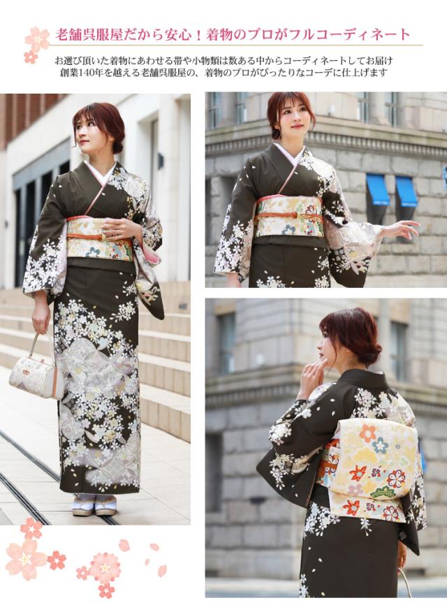 | ※モデル着用の袋帯・帯締め・帯揚げ・草履バッグ・小物類の色、デザインはイメージです。 数ある中から呉服のプロがコーディネートしてお届け致します。 | |||
