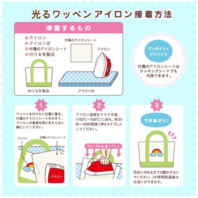 | ご注意 | アイロンを使用する際は高温になるため、取り扱いには十分ご注意ください。 アイロン圧着の際は、付属のアイロンシートをお使いください。 ●明るさは時間が経つにつれ弱まりますが、暗闇で5時間ほど発光します。 ●乳幼児の手の届かない所に保管して下さい。 ●耐候性は1〜3年になり、蓄光効果は永久ではありません。 |