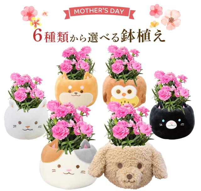 母の日 早割 ギフト カーネーション 花鉢 鉢植え プレゼント 花 母の日の花 2026 鉢花 鉢 お花 東北〜関西 送料無料 おしゃれ かわいい 三毛猫 猫 犬 ふくろう ぬいぐるみ アニマル キャラクター 母の日ギフト 母の日プレゼント 花のギフト社