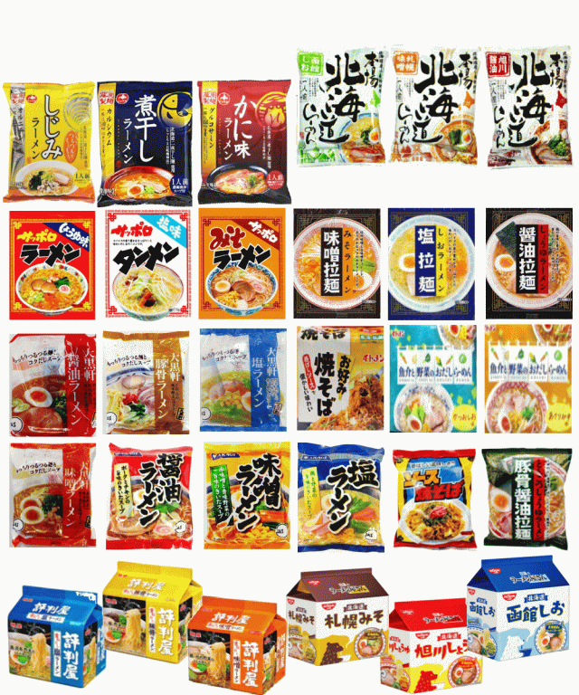 北海道産小麦粉を使用の藤原製麺、大黒食品の大黒軒、AKAGI、味のスナオシ、ポンポコラーメンの山本製粉、日清食品の袋麺が揃い踏み。