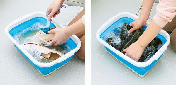 たっぷり大容量の8.5リットルの薄く畳める洗い桶です。マスクや靴、洋服を漬け洗いするのに便利です。