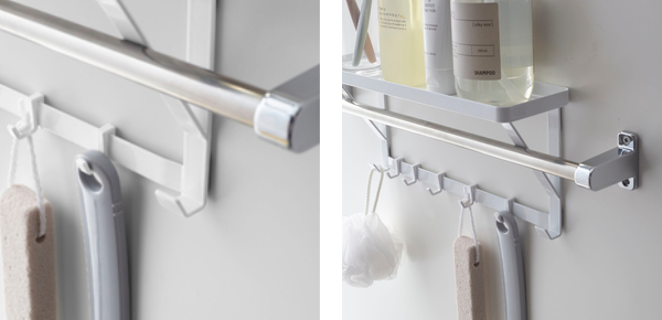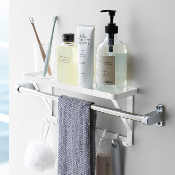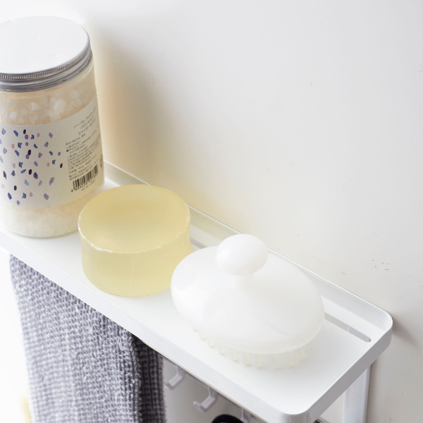 タオルバーに差し込むだけで簡単に設置できる、タオルバー上ラックです。付属のフックが5個ついているので、ラックに置いて収納するだけではなく、フックに掛けて小物もまとめて収納できます。