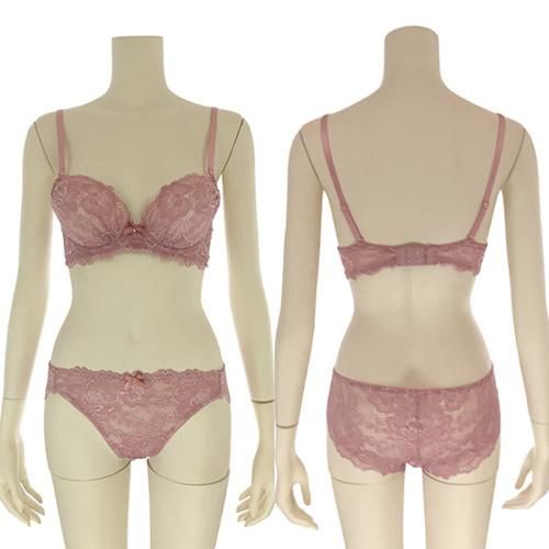 大人っぽいデザインとバック総レースによる肌の透け感がとてもセクシーなブラ・ショーツセット(ブラセット)。