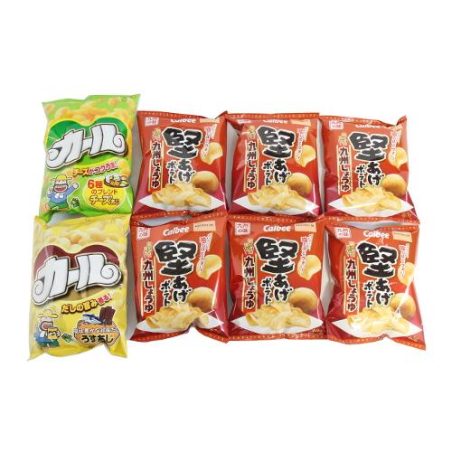 カルビーの人気商品「堅あげポテト」のコク深い鶏だしが引き出す、豊かなしょうゆの香りと旨みが特徴の九州しょうゆ味のセットです。