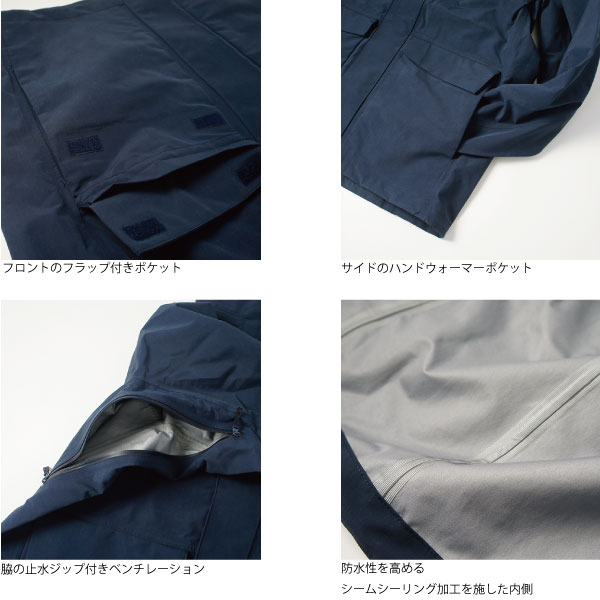 フルシーム縫製 フロントフラップドットボタン+逆開ビスロンファスナー 裾ストッパー付ドローコード 袖口面ファスナーアジャスタブル ビルトインフード フード前両脇、後ろ中心ストッパー付ドローコード ハンドウォーマーポケット 共地接着仕様 脇ベンチレーション止水ファスナー |