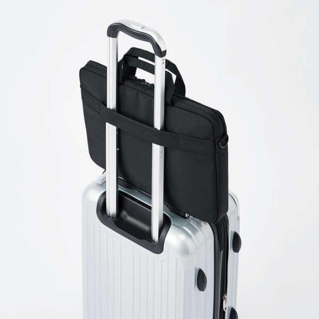 荷物が少ない方におすすめな、薄型タイプのキャリングバッグです。パソコンや書類・小物なども持ち運べる十分な収納スペースを備えたブリーフケースタイプです。前面スリーブポケットには小物を収納することができます。15.6インチまでのノートパソコンが収納可能なパソコン収納ポケットがついています。表面生地にはフッ素コーティング撥水加工を施しています。※内部への水の浸入を完全に防ぐものではありません。手提げだけでなく、付属のショルダーベルトで肩掛けも可能です。背面にキャリーバーへ固定できるキャリーベルトを配置しています。