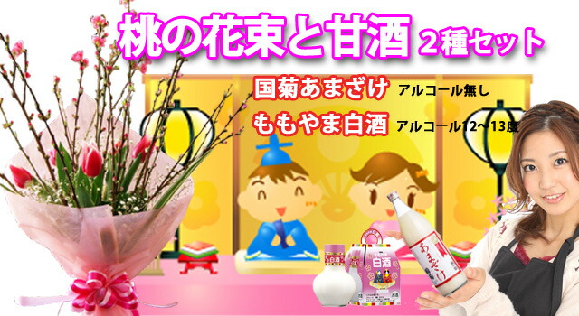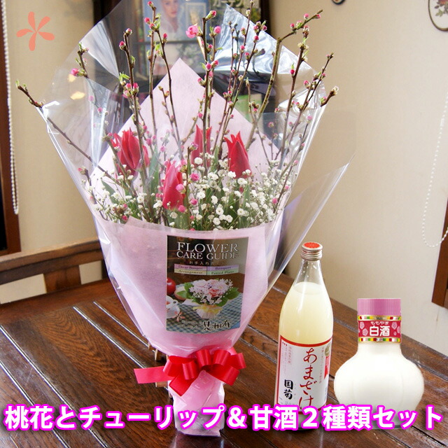 桃の節句 ひな祭り ひなまつり 甘酒セット送料無料 【 桃の花とチューリップ 花束 甘酒 2種セット 国菊 あまざけ (900ml) ももやま 白酒 (300ml)各1本 】 花桃 ひなまつり 雛祭り 花束 矢口桃 花ギフト ポイント消化 100円 300円 500円