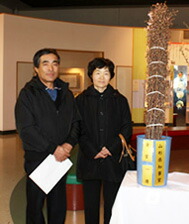 頑固親父の啓翁桜!金賞受賞のお祝いの日の奥様との写真です。2人三脚で最高級の桜をお届け するのが使命と頑張っています。 |