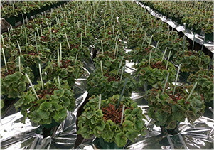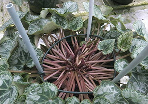 極上品を作る技術(鉢物生産) シクラメンは葉の数と花の数が対になっています。花の多いシクラメン=葉の多いシクラメン。 このためいかに葉を多く生えさせるかが極上シクラメンをつくる上で重要になります。 また、たくさんの葉をいかに美しく見せるかも極上シクラメンで大切なポイントです。 | 1.リング掛けシクラメンは写真のように株にリングを掛け、株の真ん中にしっかりと光を当てることでより多くの葉を繁らせますが、葉の力が強くリングが浮いてしまい、株の真ん中が閉じてしまうことも多々あります。 高橋氏の農場ではこのリングを鉢に3本差し込んだ支柱にしっかりと固定することで常に中心に光を当て、より多くの葉を繁らせています。 高橋氏のシクラメンでは3つの方法を用いてこれを実現しています。 2.葉組み回数 シクラメンだけでなく植物は葉から光を吸収し光合成を行い、エネルギーを作り出しています。 そのためいかに効率的に葉に光を当てるかも、極上シクラメンを作る上で重要な要素になります。葉はただ繁らせただけでは、色々な方向に生えてしまい効率よく光合成を行うことができません。 “葉組み”という葉を1枚1枚組んでいくことで葉の向きを揃え、均等に光が当たるようにします。 またこの作業によりシクラメン葉の大きさが揃い見た目に美しく仕上がっていきます。 高橋氏はこの作業を通常の倍以上の回数行うことで、ボリュームがあり、且つ決め細やかに揃った葉を作っていきます。 3.シルバーシートシクラメンを育てるベンチにシルバーのシートを張る事で株の下からも太陽の光を当てることができます。この一手間を掛けることで、良く締まった株に仕上がり、また葉が鉢を包み込むように広がり、より多くの葉が効率よく光合成を行うことができるようになります。 |
