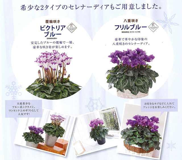 香りやポップな花色が特徴の「セレナーディア」と、深く落ち着いた色調のブルーと圧倒的な豪華さが際立つ「Cyclamen Creator Yasuhiro Takahashi(CCYT)」の2ブランドで、ブルーシクラメンの世界をお届けします。