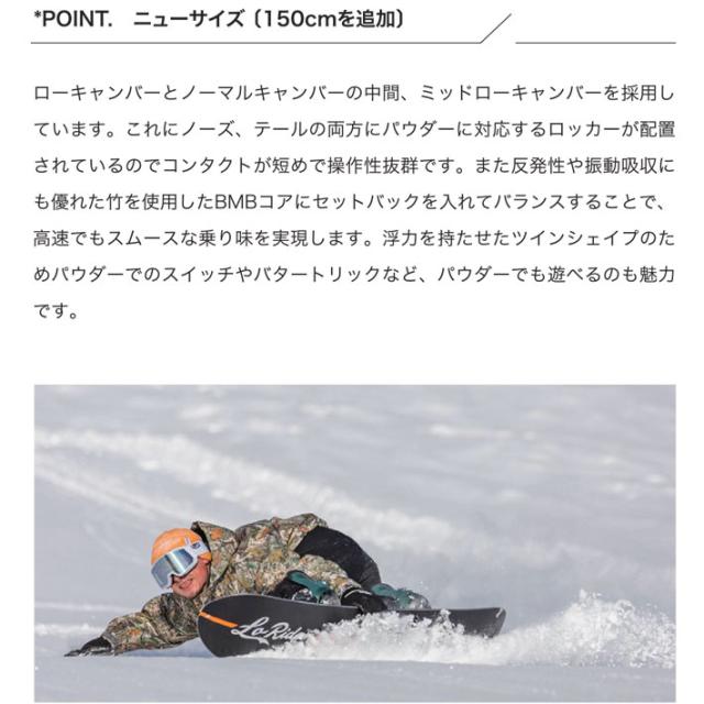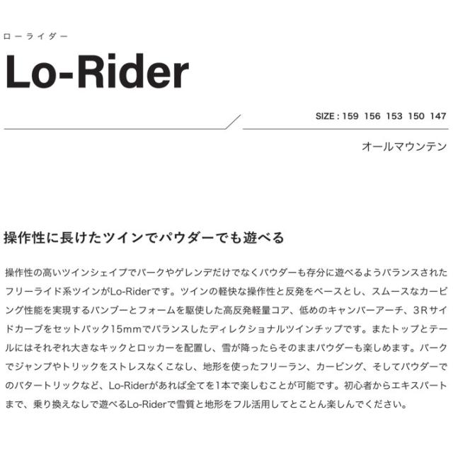 操作性の高いツインシェイプでパークやゲレンデだけでなくパウダーも存分に遊べるようにバランスされたフリーライド系ツインがLO-Riderです。