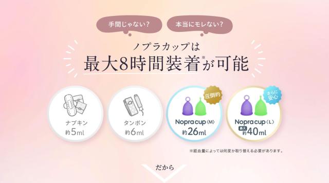 経血の量は少ない方で20ml、多い方でも40ml。また、市販のナプキンは1枚約5ml、タンポンは1本約6mlの吸収量なので、ノプラカップがあれば多い日でも安心です。タンポンやナプキンを使っていて頻繁に取り替えなくてはいけない方にはおすすめです。