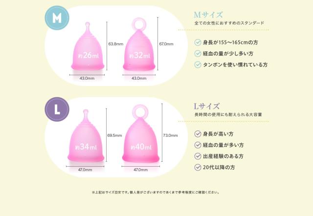 再利用可能 / ステムレスで装着時の違和感を大幅に軽減!カップの容量も大幅に増やし装着時間も12時間にアップ!Lサイズで最大45ml / 生理中の気になるモレ・ムレ・においを軽減。医療用シリコーンを100%使用しています。