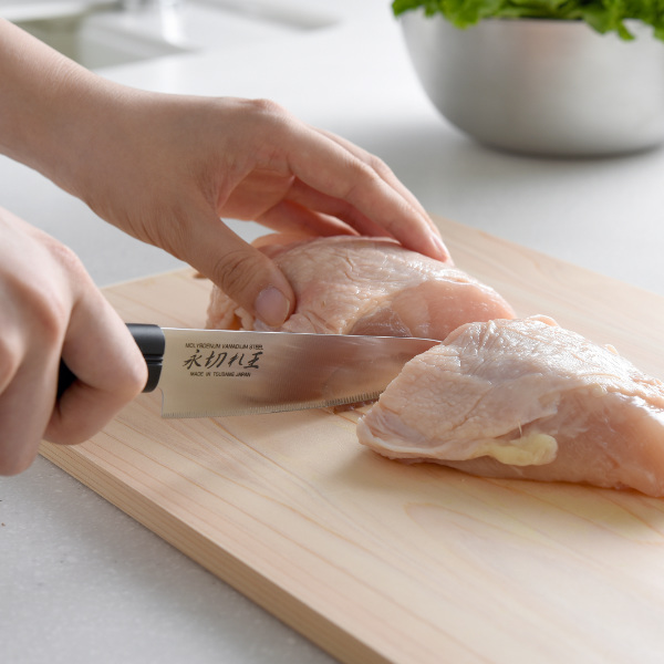 三徳包丁や牛刀などに比べ、重量も軽く小さいので、重い包丁が苦手という方や、手が小さい女性にとっては、手に馴染みやすく使いやすいのでおススメです。ちなみに300グラム位の鶏モモ肉の調理や、大きな魚でなければ3枚におろすことも十分可能です。小さいからこそ小回りが利き、細かい作業もできます。狭い台所や、キャンプ、アウトドア調理にもピッタリなので、思っている以上に用途が広い包丁です。