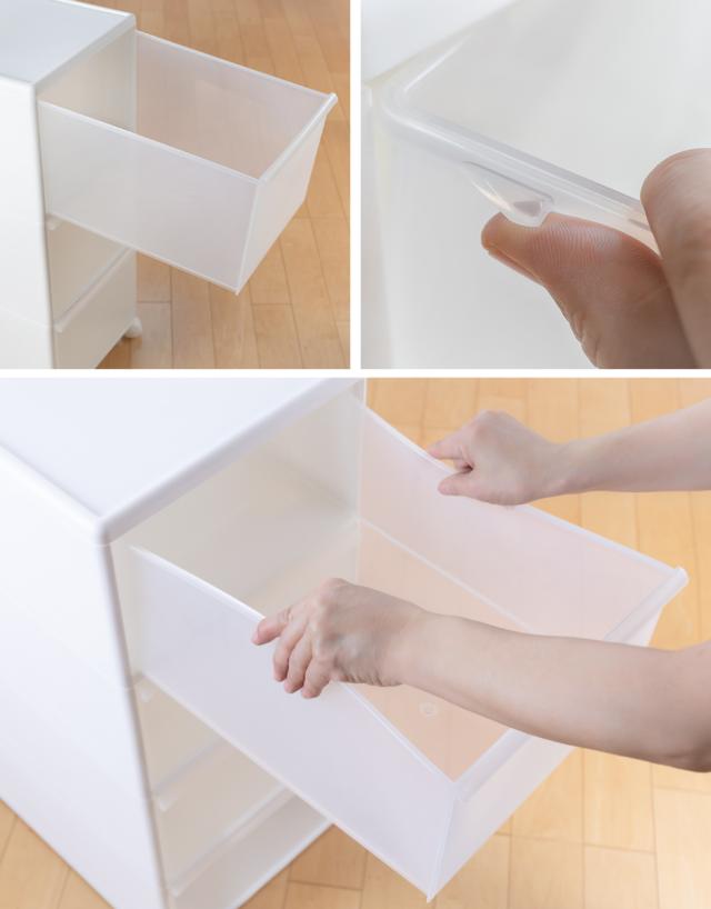 万が一引き出しすぎても安心のストッパー付きで落ちません。画像のようにストッパーのサイドを押せば、引き出しを取り外すことができます。引き出しごとそのまま入れ替えることが出来るので、衣替えの時も簡単です。