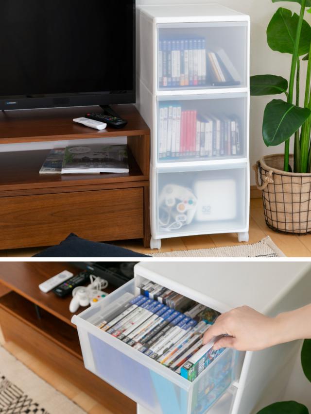 ワイドストッカーの引き出しは中身が透けすぎず、ふんわり見える半透明タイプなので、リビングにも置きやすいケースになっています。中身はごちゃごちゃ見えない、でも何を収納しているは一目で分かるので使いやすさは抜群です。リビングでは小物収納に使ったり、テレビ横に置いてコード類やゲーム機やソフト等をまとめるケースにしたりと、使い方は自由自在です。
