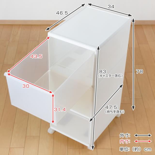 | サイズ | 約 幅34×奥行46.5×高さ78(cm) キャスター含む高さ:約83(cm) 引出し内寸:約 幅30×奥行43.5×高さ21.4(cm) |