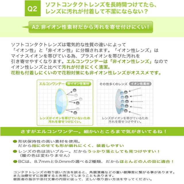 エルコンワンデーは「非イオン性レンズ」なのでイオン性レンズと比べて汚れが付きにくく清潔。