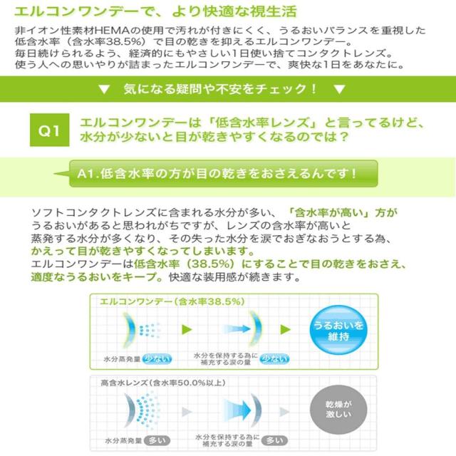 うるおいバランスを重視した低含水率(含水率38.5%)で目の乾きを抑えるエルコンワンデー。