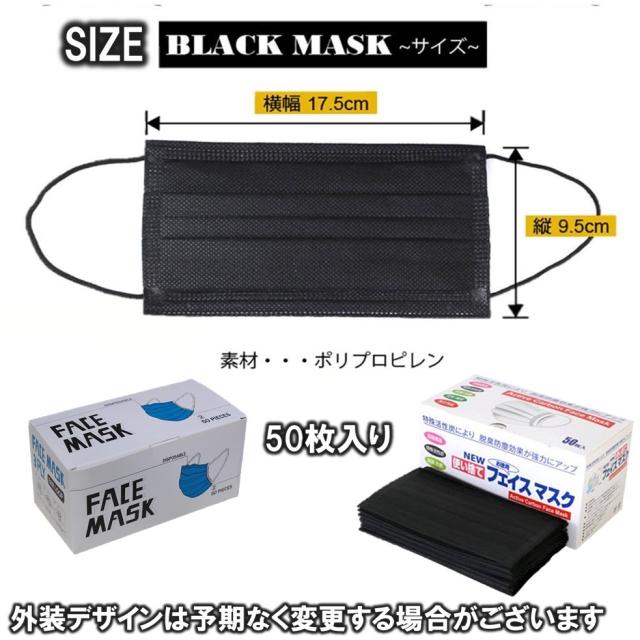 ・ 50枚ごとにOPP包装された 使い捨てタイプの黒マスクセット!