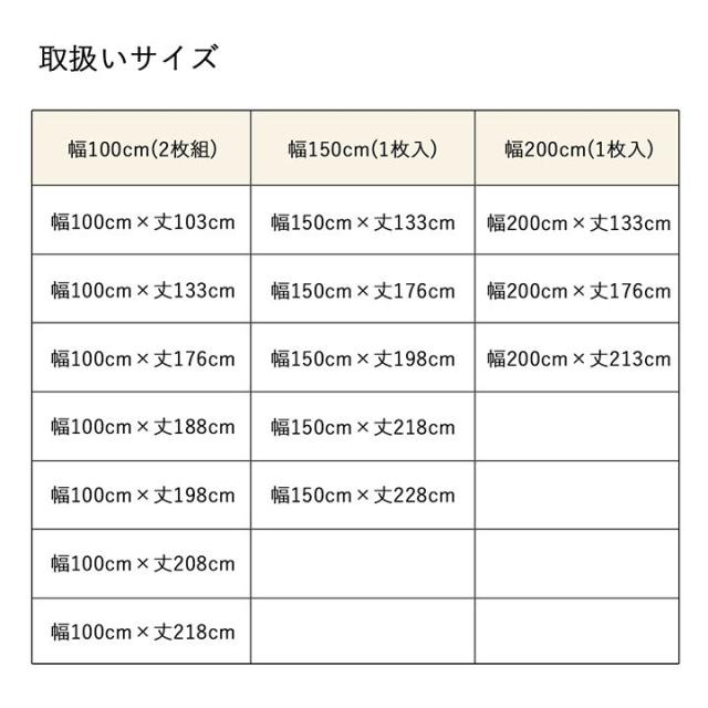| サイズ | 15サイズ展開 【幅100cm2枚組】 ・幅100×丈103cm 2枚組 ・幅100×丈133cm 2枚組 ・幅100×丈176cm 2枚組 ・幅100×丈188cm 2枚組 ・幅100×丈198cm 2枚組 ・幅100×丈208cm 2枚組 ・幅100×丈218cm 2枚組 【幅150cm1枚入】 ・幅150×丈133cm 1枚 ・幅150×丈176cm 1枚 ・幅150×丈198cm 1枚 ・幅150×丈218cm 1枚 ・幅150×丈228cm 1枚 【幅200cm1枚入】 ・幅200×丈133cm 1枚 ・幅200×丈176cm 1枚 ・幅200×丈213cm 1枚 |