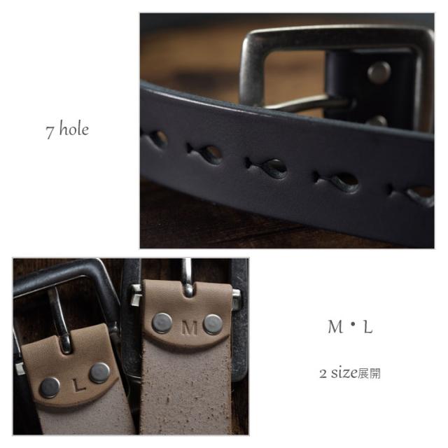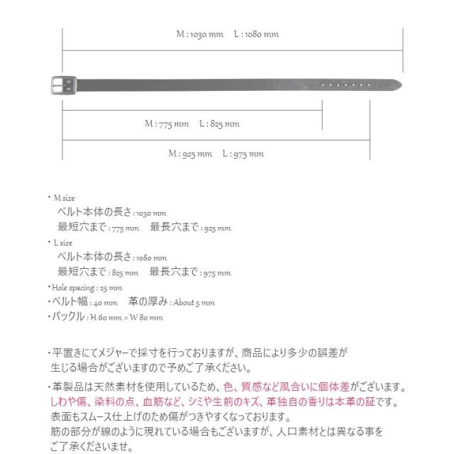 | ベルト長さ | Mサイズ:長さ103cm×幅4cm×革の厚み約5mm 最小穴まで:77.5cm×最大穴まで:92.5cm Lサイズ:長さ108cm×幅4cm×革の厚み約5mm 最小穴まで:82.5cm×最大穴まで:97.5cm ホールスパン:2.5cm |
