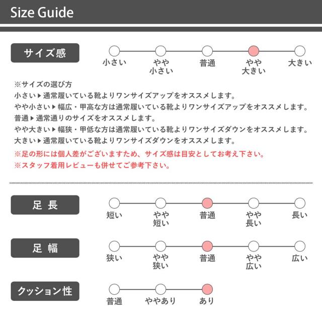 クッション性の高いインソールにより、履き心地の良さと長時間履いても疲れを感じにくいのが特徴的です。