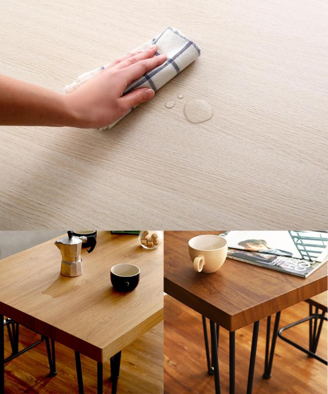天板には水や汚れに強いPVCを使用しています。飲み物がこぼれてもさっと拭くだけ、お手入れに気を使いません。また、触感にこだわった木目を側面までしっかり施し、無垢材のような重厚感を持たせています。