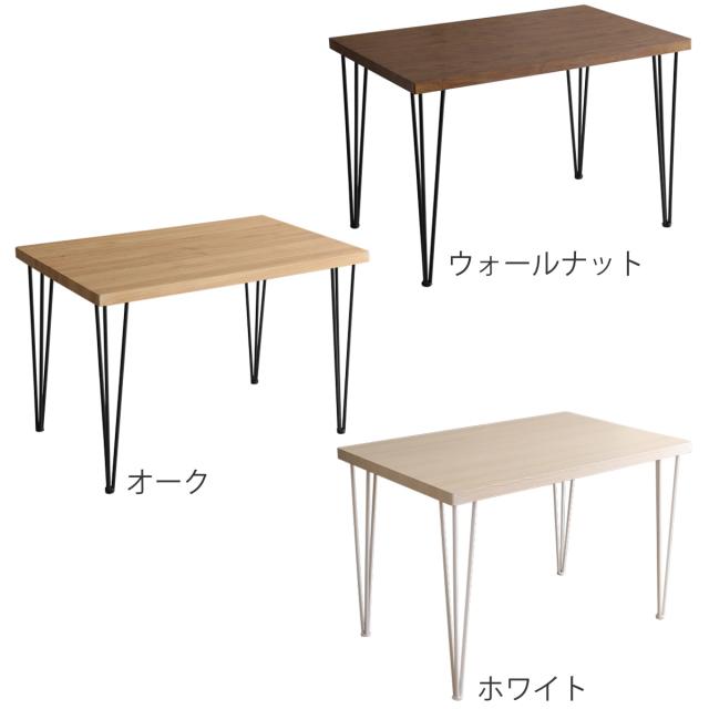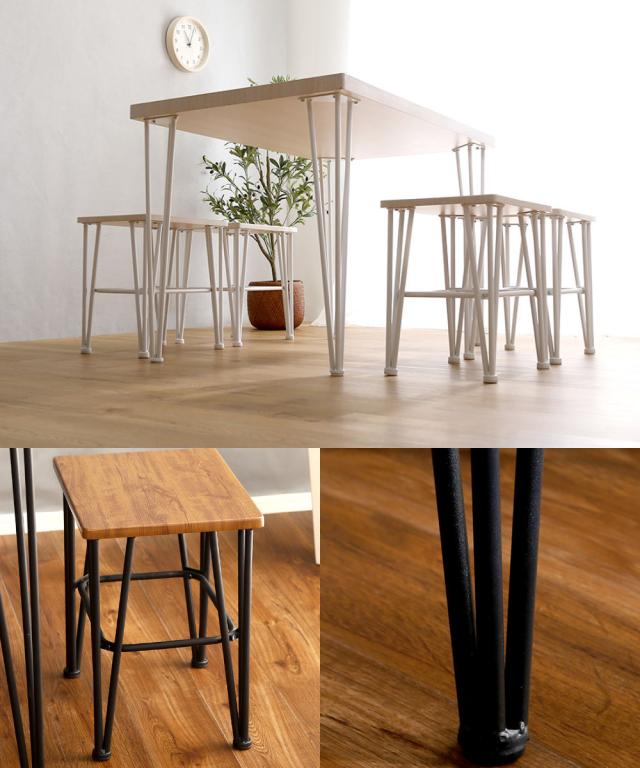 まるで無垢材のような重厚感ある天板とマットな質感のスチールがヴィンテージ感溢れるダイニング5点セットです。厚みのある天板とスタイリッシュな脚部のコントラストが、空間に軽やかなデザイン性をプラスします。カラーはウォールナット、オーク、ホワイトの3色展開です。お部屋に合わせてお選びいただけます。