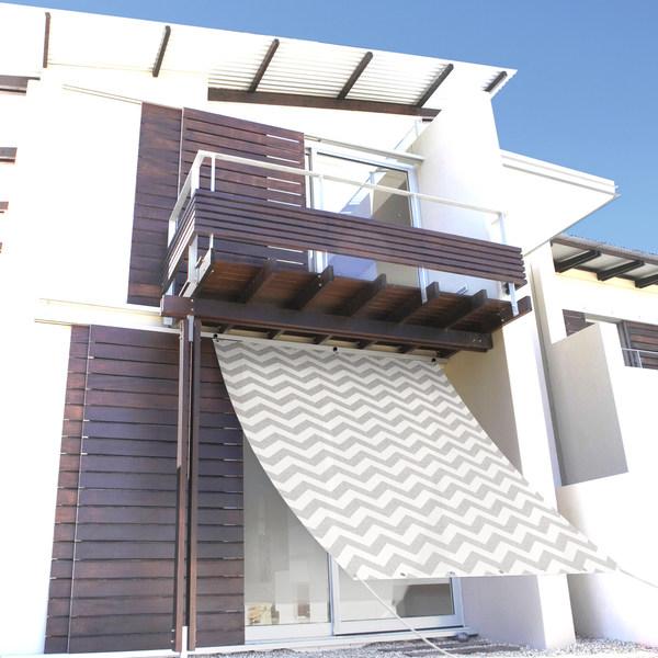 透け感がある生地を使用し、外の心地よい風が室内に入ります。シェプロン柄のモノトーンなデザインで、お庭やテラスの景観を損なわずに使えます。