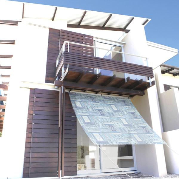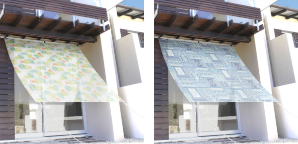 透け感がある生地を使用し、外の心地よい風が室内に入ります。涼しげなパッチワーク柄で、お庭やテラスの景観を損なわずに使えます。