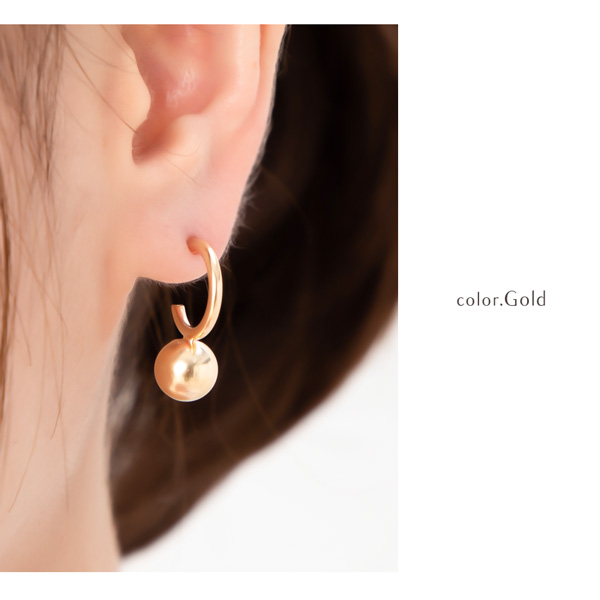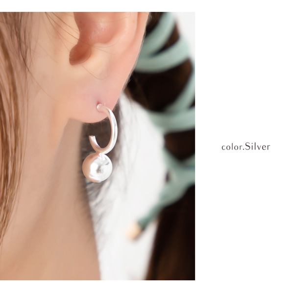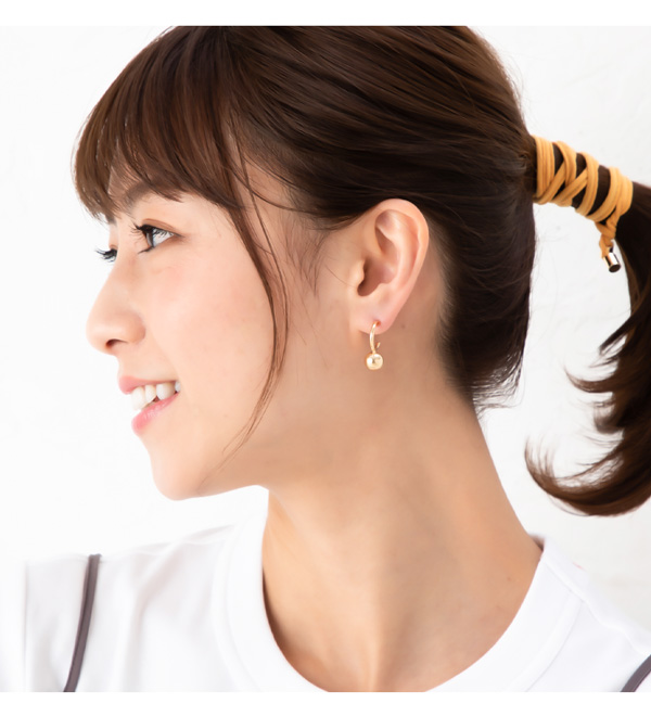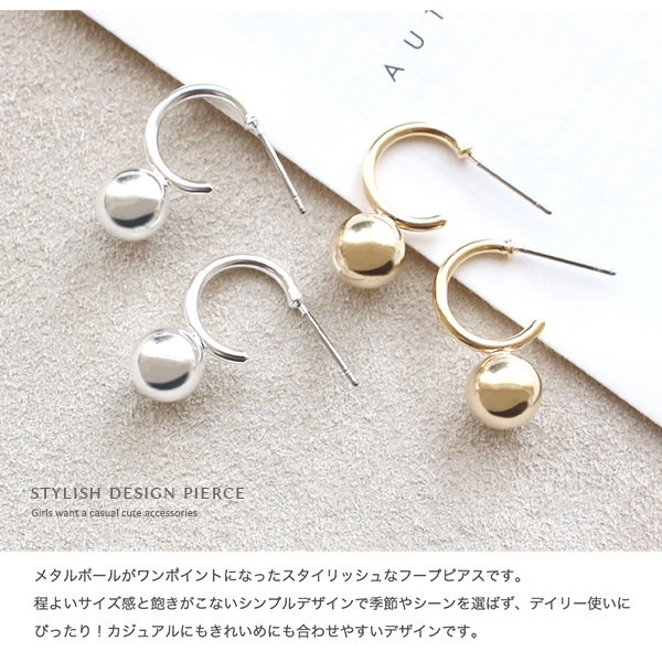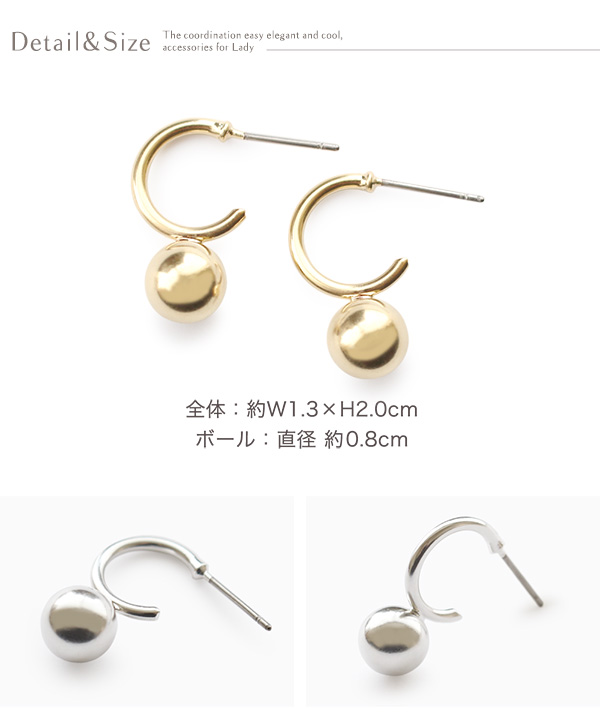 | メタルボールがワンポイントになったスタイリッシュなフープピアスです。 程よいサイズ感と飽きがこないシンプルデザインで季節やシーンを選ばず、デイリー使いにぴったり! カジュアルにもきれいめにも合わせやすいデザインです。 | |