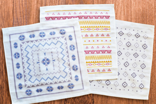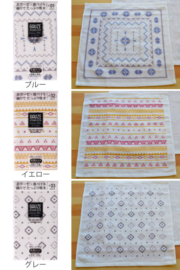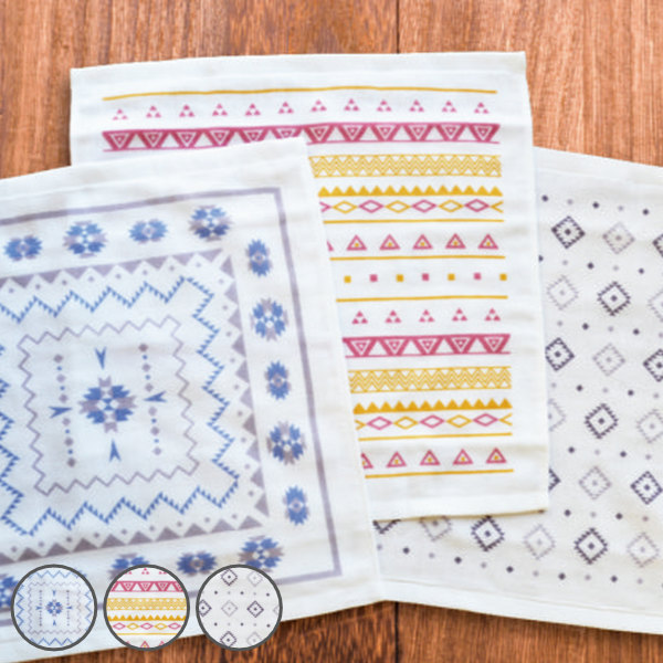 表面はガーゼ織りでやわらかく、裏面はパイル織りにしてあるので、水分をしっかりと吸収します。ネイティブアメリカン的な民族風デザインです。